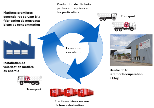 Nous trions ensuite et conditionnons ces déchets en fractions valorisables dans des installations appropriées, soit sous la forme de matières servant à produire de nouveaux biens, soit sous la forme d’énergie. Nous contribuons ainsi au cercle vertueux de l’économie circulaire.